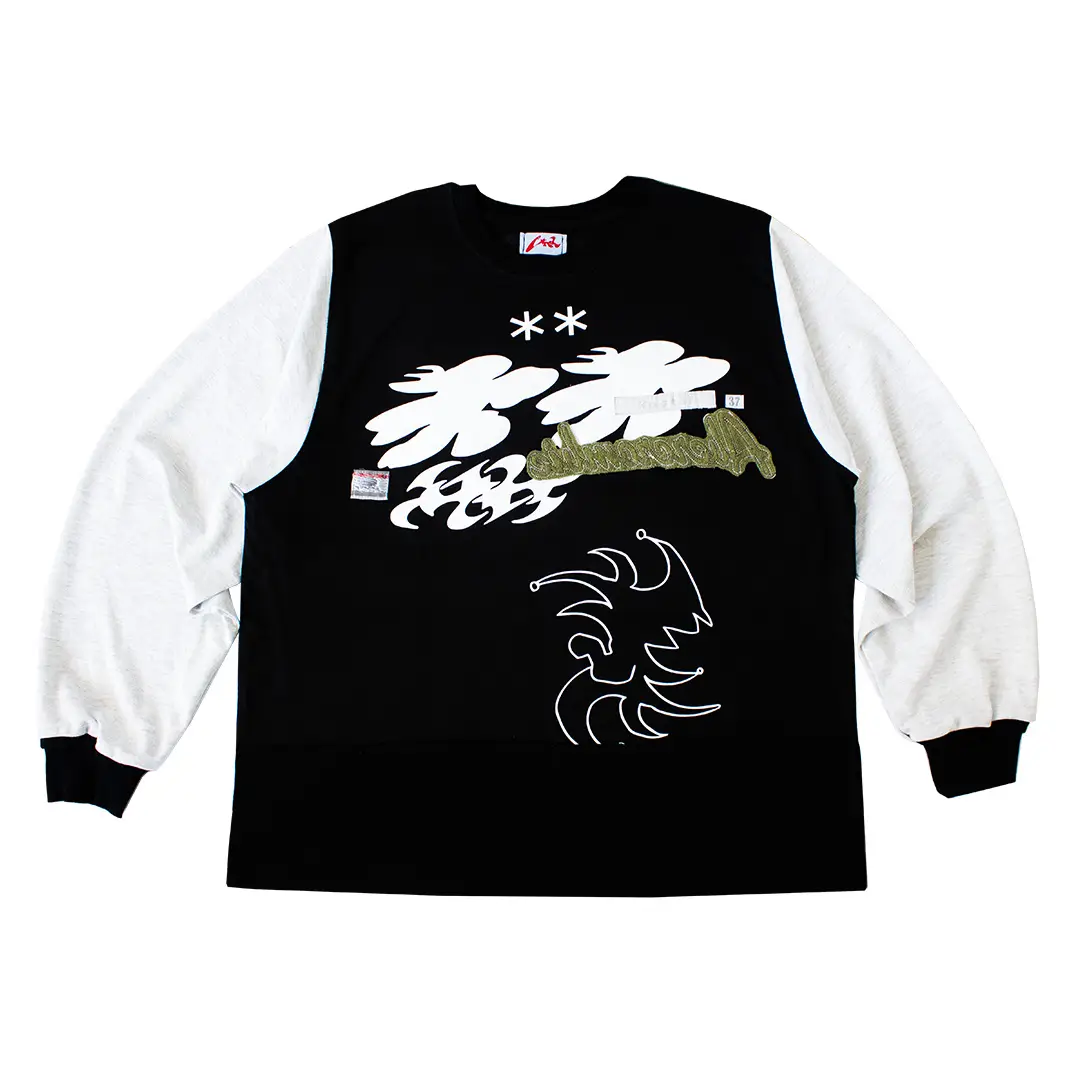 - Remera con estampa serigrafia + rework mangas a rallas color rosa y negro puños color gris + diseño de etiquetas.