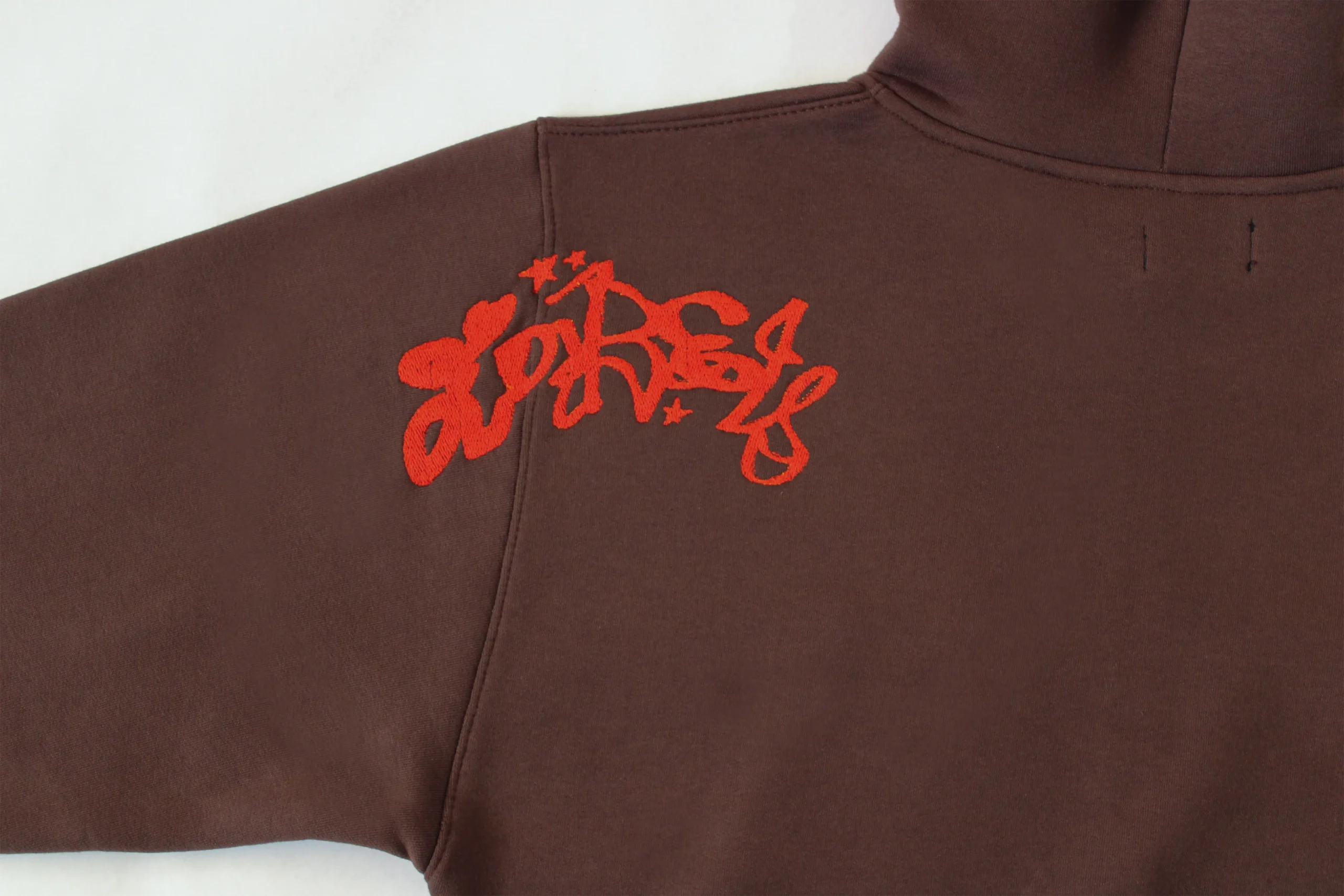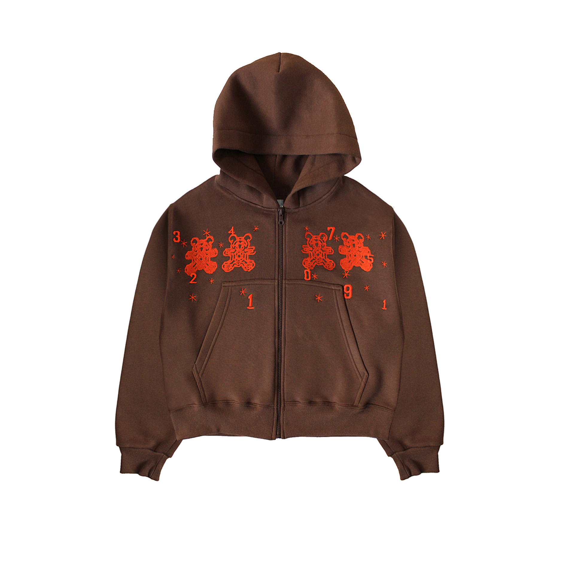 - Campera de algodón color chocolate + bordados rojos.